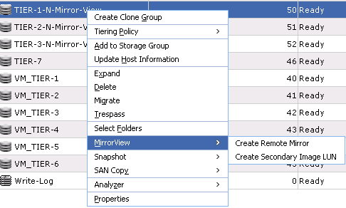 Teraz przechodzimy do skonfigurowania replik, tworzymy nowe LUNy (lub wybieramy stare) i z menu wybieramy “Create Remote Mirror”.