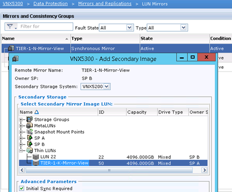 Wybieramy LUN i klikamy “Add Secondary”, wcześniej przygotowany LUN na zdalnej macierzy musi być tej samej wielkości co źródłowy i nie może być przypisany do żadnej “Storage Groups”.